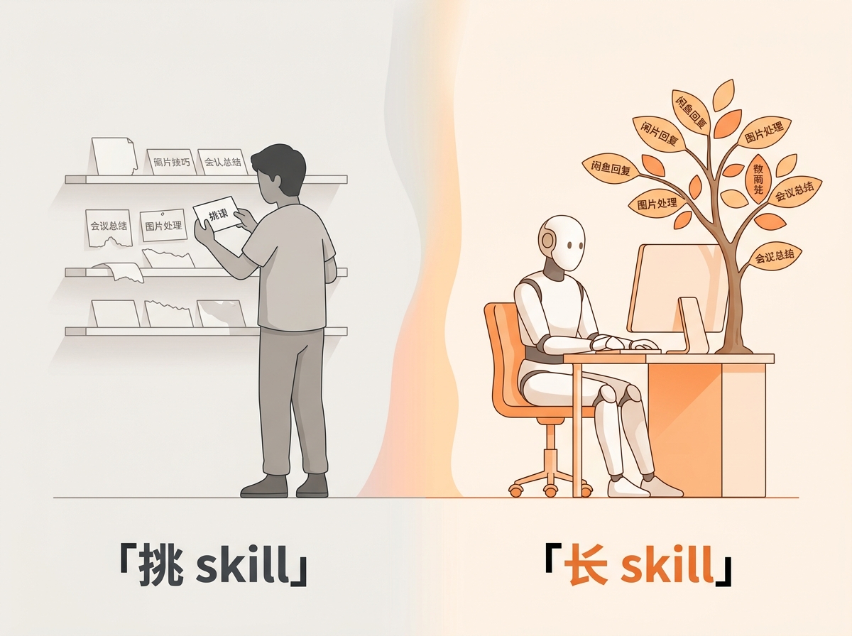 开头那个「第 5 天自己写 skill 替我回闲鱼私信」场景,不是段子,不是美化,是架构天然产物。对做副业的人,最直白的翻译是 · 一个会替你攒 SOP 的学徒,比一个只会执行你指令的工具,值钱得多。