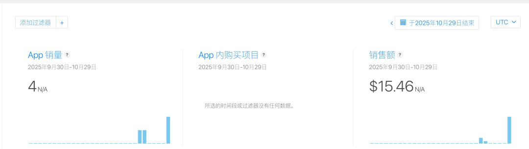 上周把我的第一款工具应用 Vibe Manager 上架,今天去connect查了下趋势,结果发现了小惊喜:总共成交 4 单,其中 3 单来自国内低价区,1 单来自北美 9.9 美元。小额但真实,证明这条产品线跑通了。